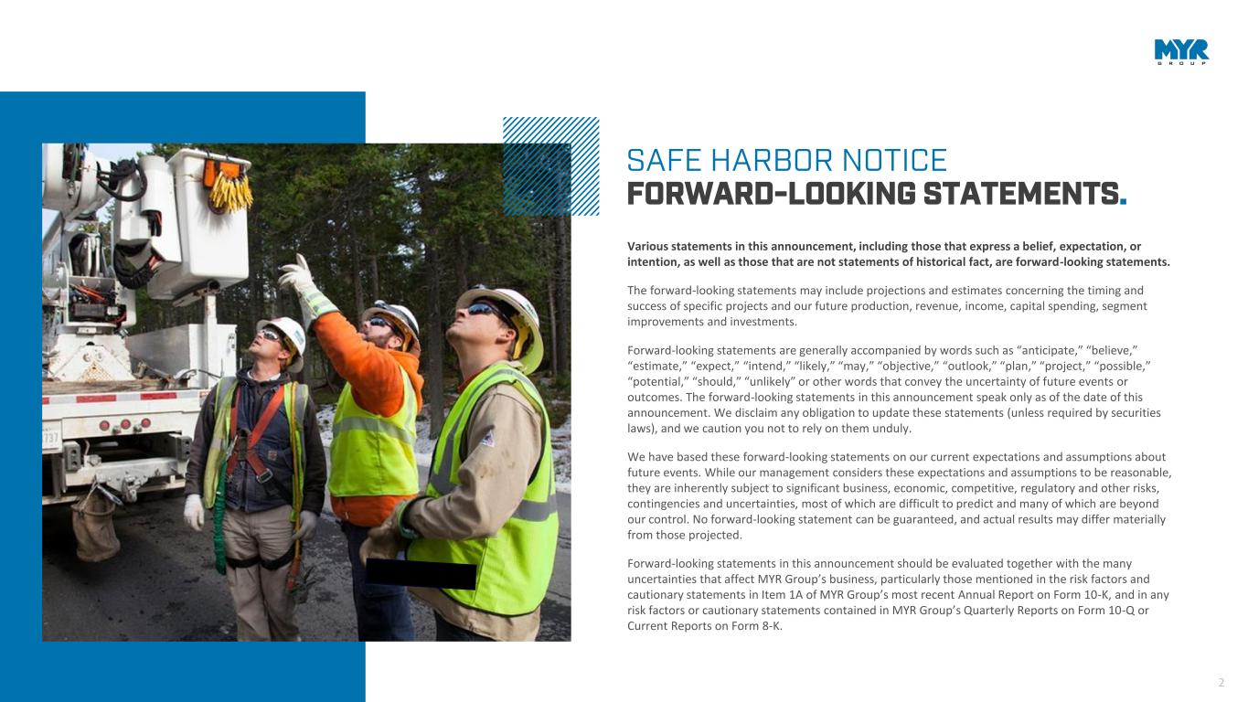 2 Various statements in this announcement, including those that express a belief, expectation, or intention, as well as those that are not statements of historical fact, are forward-looking statements. The forward-looking statements may include projections and estimates concerning the timing and success of specific projects and our future production, revenue, income, capital spending, segment improvements and investments. Forward-looking statements are generally accompanied by words such as “anticipate,” “believe,” “estimate,” “expect,” “intend,” “likely,” “may,” “objective,” “outlook,” “plan,” “project,” “possible,” “potential,” “should,” “unlikely” or other words that convey the uncertainty of future events or outcomes. The forward-looking statements in this announcement speak only as of the date of this announcement. We disclaim any obligation to update these statements (unless required by securities laws), and we caution you not to rely on them unduly. We have based these forward-looking statements on our current expectations and assumptions about future events. While our management considers these expectations and assumptions to be reasonable, they are inherently subject to significant business, economic, competitive, regulatory and other risks, contingencies and uncertainties, most of which are difficult to predict and many of which are beyond our control. No forward-looking statement can be guaranteed, and actual results may differ materially from those projected. Forward-looking statements in this announcement should be evaluated together with the many uncertainties that affect MYR Group’s business, particularly those mentioned in the risk factors and cautionary statements in Item 1A of MYR Group’s most recent Annual Report on Form 10-K, and in any risk factors or cautionary statements contained in MYR Group’s Quarterly Reports on Form 10-Q or Current Reports on Form 8-K. SAFE HARBOR NOTICE FORWARD-LOOKING STATEMENTS.