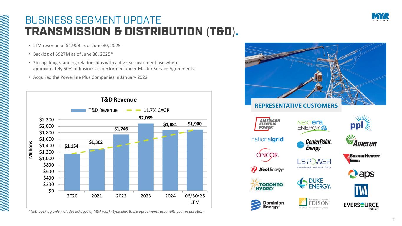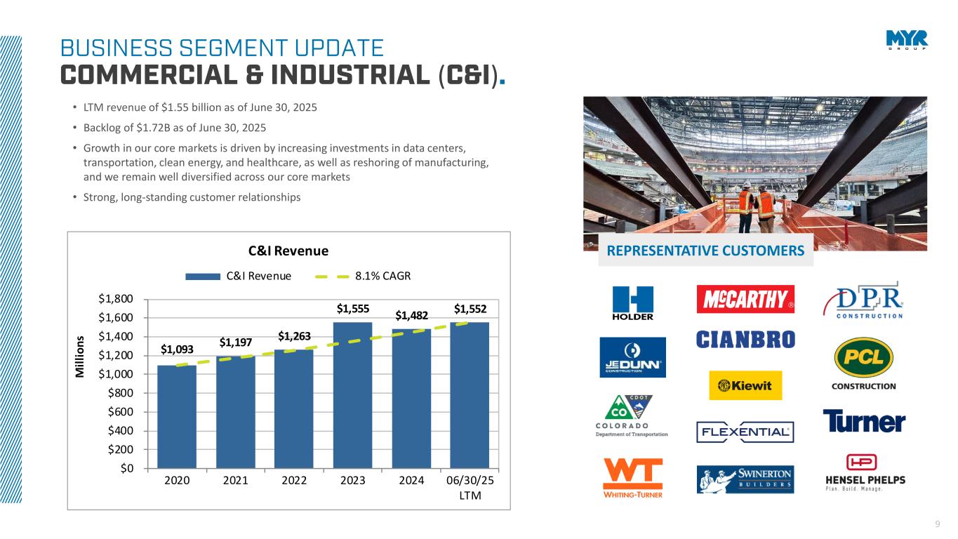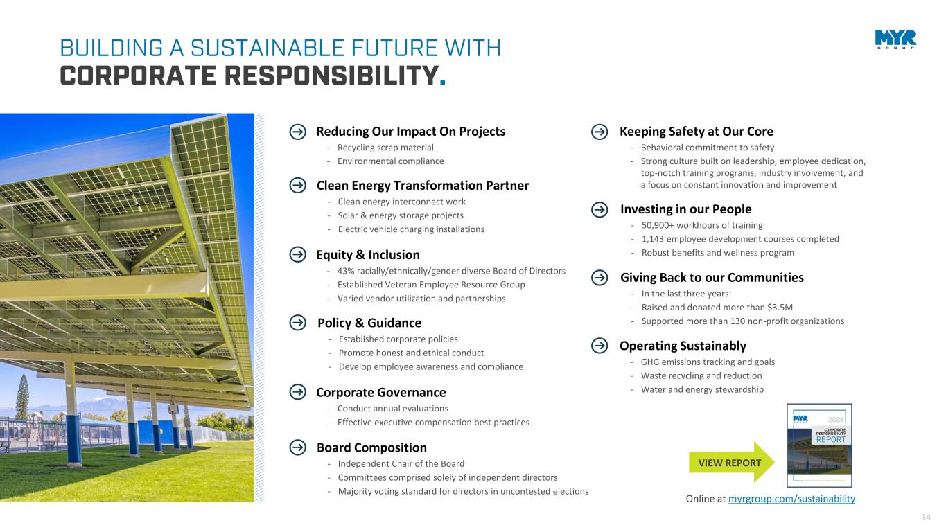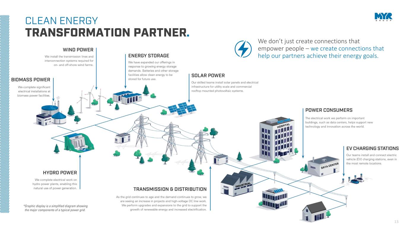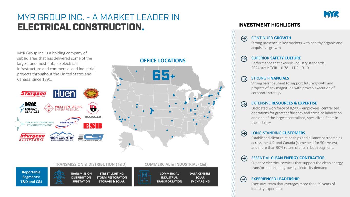 3 65+ OFFICE LOCATIONS MYR Group Inc. is a holding company of subsidiaries that has delivered some of the largest and most notable electrical infrastructure and commercial and industrial projects throughout the United States and Canada, since 1891. MYR GROUP INC. - A MARKET LEADER IN ELECTRICAL CONSTRUCTION. CONTINUED GROWTH Strong presence in key markets with healthy organic and acquisitive growth SUPERIOR SAFETY CULTURE Performance that exceeds industry standards; 2024 stats: TCIR – 0.78 LTIR - 0.10 STRONG FINANCIALS Strong balance sheet to support future growth and projects of any magnitude with proven execution of corporate strategy EXTENSIVE RESOURCES & EXPERTISE Dedicated workforce of 8,500+ employees, centralized operations for greater efficiency and cross-collaboration and one of the largest centralized, specialized fleets in the industry LONG-STANDING CUSTOMERS Established client relationships and alliance partnerships across the U.S. and Canada (some held for 50+ years), and more than 90% return clients in both segments ESSENTIAL CLEAN ENERGY CONTRACTOR Superior electrical services that support the clean energy transformation and growing electricity demand EXPERIENCED LEADERSHIP Executive team that averages more than 29 years of industry experience Reportable Segments: T&D and C&I COMMERCIAL INDUSTRIAL TRANSPORTATION DATA CENTERS SOLAR EV CHARGING COMMERCIAL & INDUSTRIAL (C&I) TRANSMISSION DISTRIBUTION SUBSTATION STREET LIGHTING STORM RESTORATION STORAGE & SOLAR TRANSMISSION & DISTRIBUTION (T&D) INVESTMENT HIGHLIGHTS