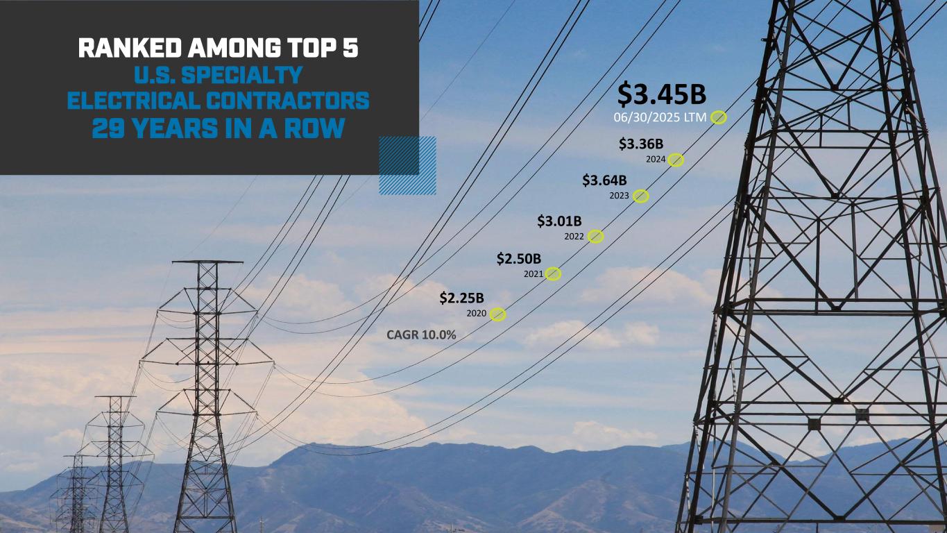4 $3.45B 06/30/2025 LTM $2.25B 2020 $2.50B 2021 $3.01B 2022 $3.36B 2024 RANKED AMONG TOP 5 U.S. SPECIALTY ELECTRICAL CONTRACTORS 29 YEARS IN A ROW $3.64B 2023 CAGR 10.0%