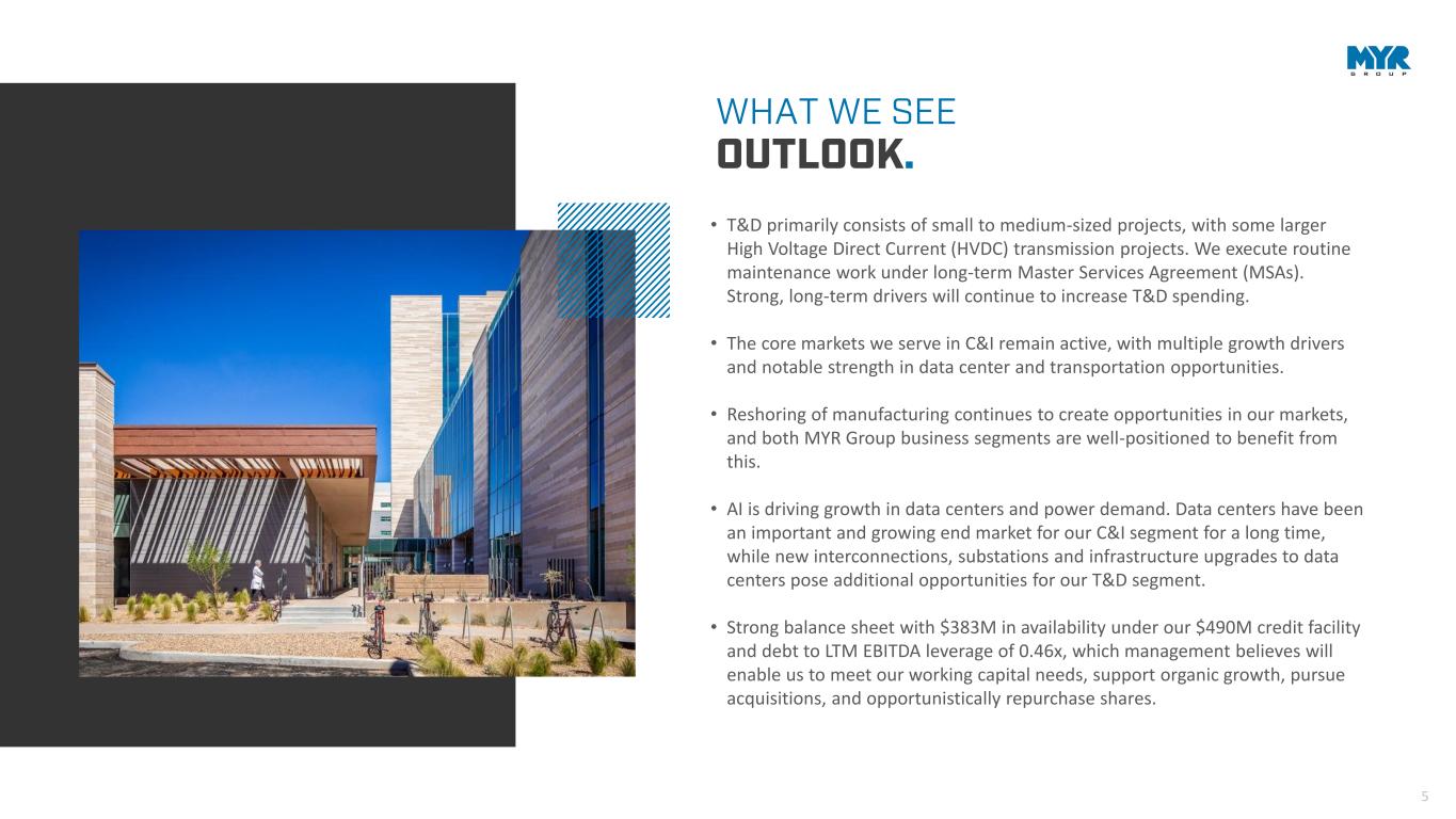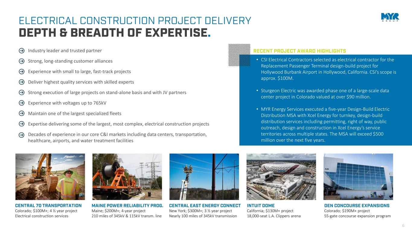 5 • T&D primarily consists of small to medium-sized projects, with some larger High Voltage Direct Current (HVDC) transmission projects. We execute routine maintenance work under long-term Master Services Agreement (MSAs). Strong, long-term drivers will continue to increase T&D spending. • The core markets we serve in C&I remain active, with multiple growth drivers and notable strength in data center and transportation opportunities. • Reshoring of manufacturing continues to create opportunities in our markets, and both MYR Group business segments are well-positioned to benefit from this. • AI is driving growth in data centers and power demand. Data centers have been an important and growing end market for our C&I segment for a long time, while new interconnections, substations and infrastructure upgrades to data centers pose additional opportunities for our T&D segment. • Strong balance sheet with $383M in availability under our $490M credit facility and debt to LTM EBITDA leverage of 0.46x, which management believes will enable us to meet our working capital needs, support organic growth, pursue acquisitions, and opportunistically repurchase shares. WHAT WE SEE OUTLOOK.