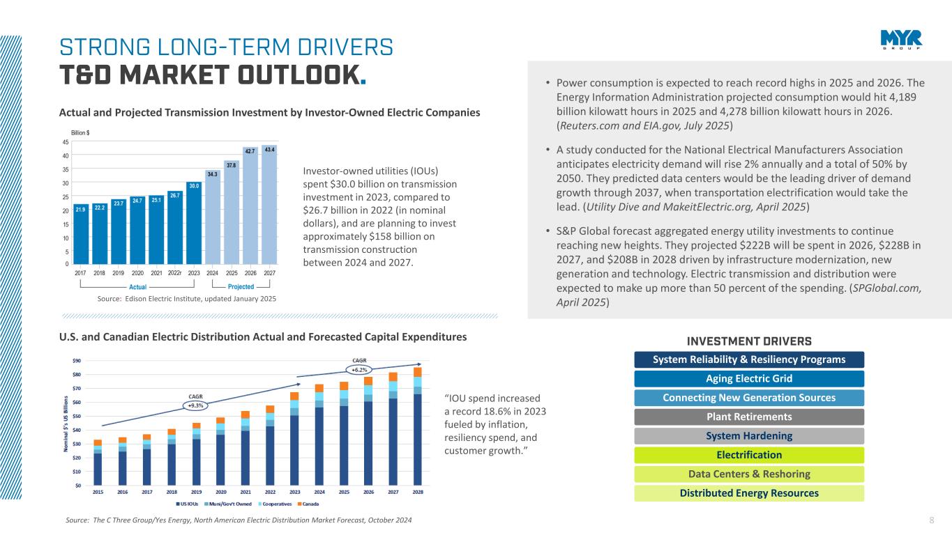 8Source: The C Three Group/Yes Energy, North American Electric Distribution Market Forecast, October 2024 “IOU spend increased a record 18.6% in 2023 fueled by inflation, resiliency spend, and customer growth.” U.S. and Canadian Electric Distribution Actual and Forecasted Capital Expenditures STRONG LONG-TERM DRIVERS T&D MARKET OUTLOOK. Source: Edison Electric Institute, updated January 2025 Actual and Projected Transmission Investment by Investor-Owned Electric Companies Investor-owned utilities (IOUs) spent $30.0 billion on transmission investment in 2023, compared to $26.7 billion in 2022 (in nominal dollars), and are planning to invest approximately $158 billion on transmission construction between 2024 and 2027. • Power consumption is expected to reach record highs in 2025 and 2026. The Energy Information Administration projected consumption would hit 4,189 billion kilowatt hours in 2025 and 4,278 billion kilowatt hours in 2026. (Reuters.com and EIA.gov, July 2025) • A study conducted for the National Electrical Manufacturers Association anticipates electricity demand will rise 2% annually and a total of 50% by 2050. They predicted data centers would be the leading driver of demand growth through 2037, when transportation electrification would take the lead. (Utility Dive and MakeitElectric.org, April 2025) • S&P Global forecast aggregated energy utility investments to continue reaching new heights. They projected $222B will be spent in 2026, $228B in 2027, and $208B in 2028 driven by infrastructure modernization, new generation and technology. Electric transmission and distribution were expected to make up more than 50 percent of the spending. (SPGlobal.com, April 2025) System Reliability & Resiliency Programs Aging Electric Grid Connecting New Generation Sources Plant Retirements System Hardening Electrification Data Centers & Reshoring Distributed Energy Resources INVESTMENT DRIVERS