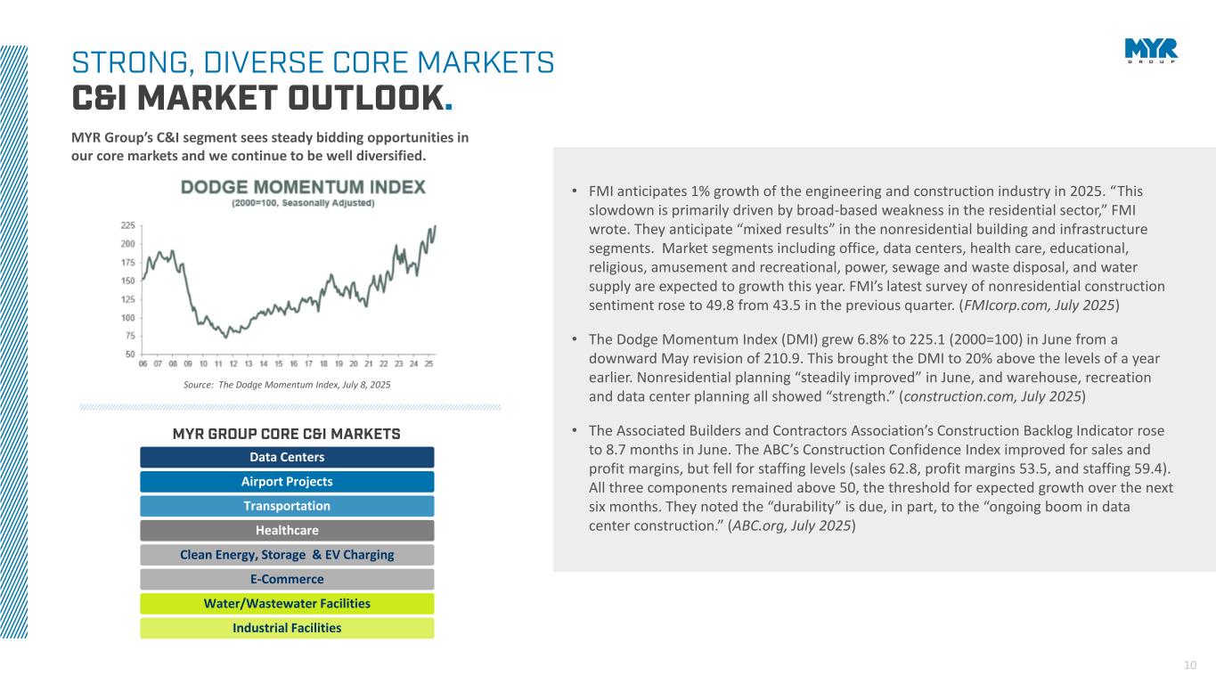 10 Data Centers Airport Projects Transportation Healthcare Clean Energy, Storage & EV Charging E-Commerce Water/Wastewater Facilities Industrial Facilities MYR GROUP CORE C&I MARKETS STRONG, DIVERSE CORE MARKETS C&I MARKET OUTLOOK. • FMI anticipates 1% growth of the engineering and construction industry in 2025. “This slowdown is primarily driven by broad-based weakness in the residential sector,” FMI wrote. They anticipate “mixed results” in the nonresidential building and infrastructure segments. Market segments including office, data centers, health care, educational, religious, amusement and recreational, power, sewage and waste disposal, and water supply are expected to growth this year. FMI’s latest survey of nonresidential construction sentiment rose to 49.8 from 43.5 in the previous quarter. (FMIcorp.com, July 2025) • The Dodge Momentum Index (DMI) grew 6.8% to 225.1 (2000=100) in June from a downward May revision of 210.9. This brought the DMI to 20% above the levels of a year earlier. Nonresidential planning “steadily improved” in June, and warehouse, recreation and data center planning all showed “strength.” (construction.com, July 2025) • The Associated Builders and Contractors Association’s Construction Backlog Indicator rose to 8.7 months in June. The ABC’s Construction Confidence Index improved for sales and profit margins, but fell for staffing levels (sales 62.8, profit margins 53.5, and staffing 59.4). All three components remained above 50, the threshold for expected growth over the next six months. They noted the “durability” is due, in part, to the “ongoing boom in data center construction.” (ABC.org, July 2025) Source: The Dodge Momentum Index, July 8, 2025 MYR Group’s C&I segment sees steady bidding opportunities in our core markets and we continue to be well diversified.