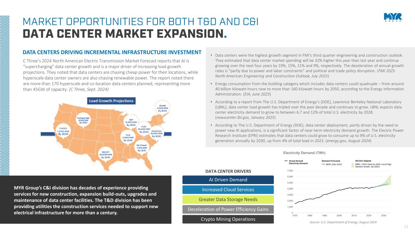 11 MARKET OPPORTUNITIES FOR BOTH T&D AND C&I DATA CENTER MARKET EXPANSION. AI Driven Demand Increased Cloud Services Greater Data Storage Needs Deceleration of Power Efficiency Gains Crypto Mining Operations DATA CENTER DRIVERS DATA CENTERS DRIVING INCREMENTAL INFRASTRUCTURE INVESTMENT C Three’s 2024 North American Electric Transmission Market Forecast reports that AI is “supercharging” data center growth and is a major driver of increasing load growth projections. They noted that data centers are chasing cheap power for their locations, while hyperscale data center owners are also chasing renewable power. The report noted there are more than 170 hyperscale and co-location data centers planned, representing more than 45GW of capacity. (C Three, Sept. 2024) • Data centers were the highest growth segment in FMI’s third quarter engineering and construction outlook. They estimated that data center market spending will be 32% higher this year than last year and continue growing over the next four years by 19%, 15%, 11% and 9%, respectively. The deceleration of annual growth rates is “partly due to power and labor constraints” and political and trade policy disruption. (FMI 2025 North American Engineering and Construction Outlook, July 2025) • Energy consumption from the building category which includes data centers could quadruple – from around 40 billion kilowatt-hours now to more than 160 kilowatt-hours by 2050, according to the Energy Information Administration. (EIA, June 2025) • According to a report from The U.S. Department of Energy’s (DOE), Lawrence Berkeley National Laboratory (LBNL), data center load growth has tripled over the past decade and continues to grow. LBNL expects data center electricity demand to grow to between 6.7 and 12% of total U.S. electricity by 2028. (newscenter.lbl.gov, January 2025) • According to The U.S. Department of Energy (DOE), data center deployment, partly driven by the need to power new AI applications, is a significant factor of near-term electricity demand growth. The Electric Power Research Institute (EPRI) estimates that data centers could grow to consume up to 9% of U.S. electricity generation annually by 2030, up from 4% of total load in 2023. (energy.gov, August 2024) MYR Group’s C&I division has decades of experience providing services for new construction, expansion build-outs, upgrades and maintenance of data center facilities. The T&D division has been providing utilities the construction services needed to support new electrical infrastructure for more than a century. Source: U.S. Department of Energy, August 2024