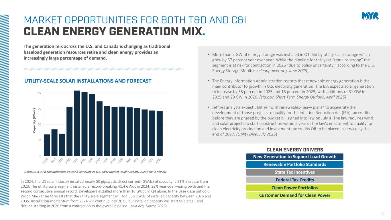 12 MARKET OPPORTUNITIES FOR BOTH T&D AND C&I CLEAN ENERGY GENERATION MIX. New Generation to Support Load Growth Renewable Portfolio Standards State Tax Incentives Federal Tax Credits Clean Power Portfolios Customer Demand for Clean Power CLEAN ENERGY DRIVERS UTILITY-SCALE SOLAR INSTALLATIONS AND FORECAST SOURCE: SEIA/Wood Mackenzie Power & Renewables U.S. Solar Market Insight Report, 2024 Year in Review In 2024, the US solar industry installed nearly 50 gigawatts direct current (GWdc) of capacity, a 21% increase from 2023. The utility-scale segment installed a record-breaking 41.4 GWdc in 2024, 33% year-over-year growth and the second consecutive annual record. Developers installed more than 16 GWdc in Q4 alone. In the Base Case outlook, Wood Mackenzie forecasts that the utility-scale segment will add 356 GWdc of installed capacity between 2025 and 2035. Installation momentum from 2024 will continue into 2025, but installed capacity will start to plateau and decline starting in 2026 from a contraction in the overall pipeline. (seia.org, March 2025) The generation mix across the U.S. and Canada is changing as traditional baseload generation resources retire and clean energy provides an increasingly large percentage of demand. • More than 2 GW of energy storage was installed in Q1, led by utility scale storage which grew by 57 percent year over year. While the pipeline for this year “remains strong” the segment is at risk for contraction in 2026 “due to policy uncertainty,” according to the U.S. Energy Storage Monitor. (cleanpower.org, June 2025) • The Energy Information Administration reports that renewable energy generation is the main contributor to growth in U.S. electricity generation. The EIA expects solar generation to increase by 35 percent in 2025 and 18 percent in 2025, with additions of 31 GW in 2025 and 29 GW in 2026. (eia.gov, Short Term Energy Outlook, April 2025) • Jeffries analysts expect utilities “with renewables-heavy plans” to accelerate the development of those projects to qualify for the Inflation Reduction Act (IRA) tax credits before they are phased by the budget bill signed into law on July 4. The law requires wind and solar projects to start construction within a year of the law’s enactment to qualify for clean electricity production and investment tax credits OR to be placed in service by the end of 2027. (Utility Dive, July 2025)