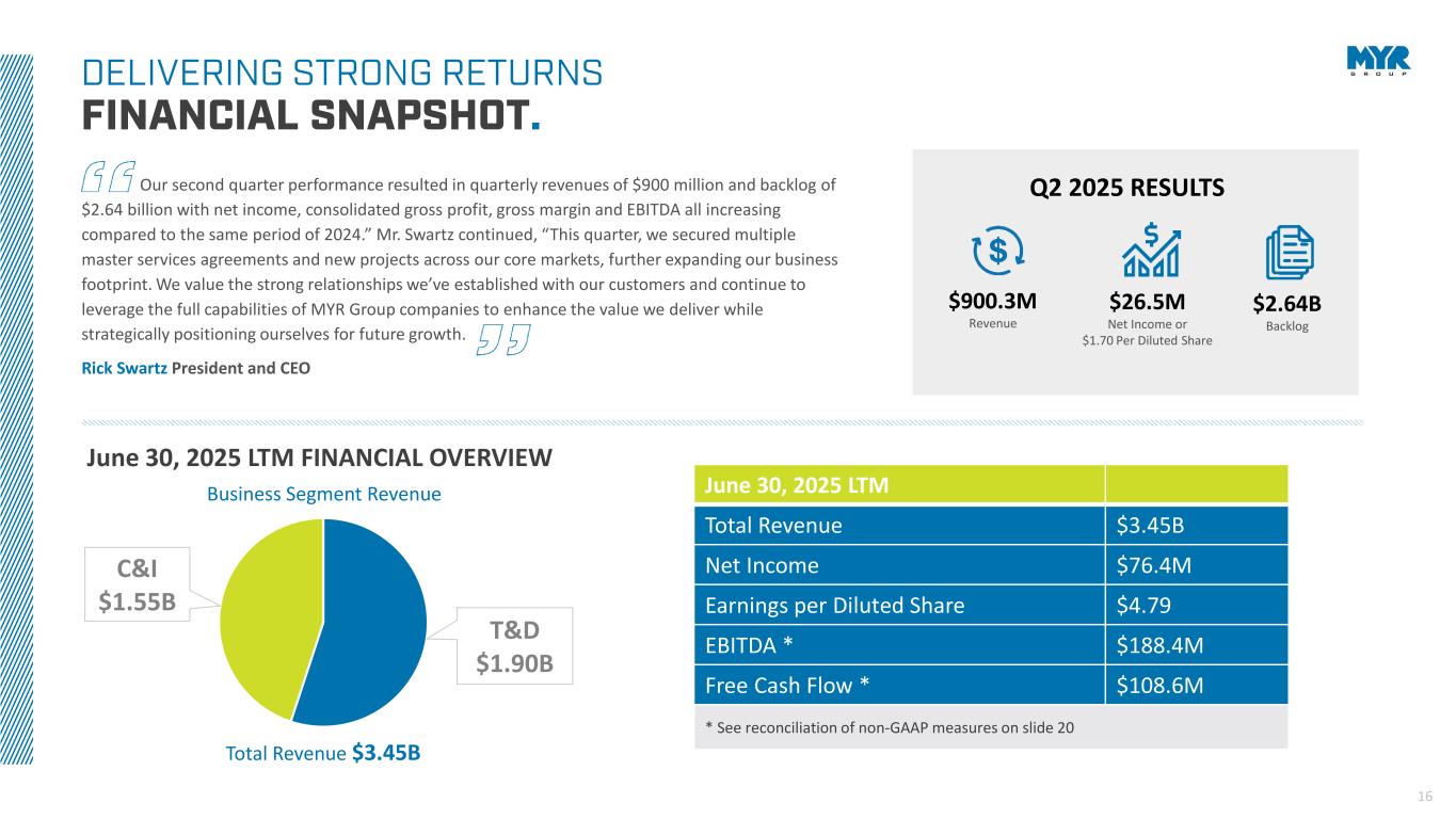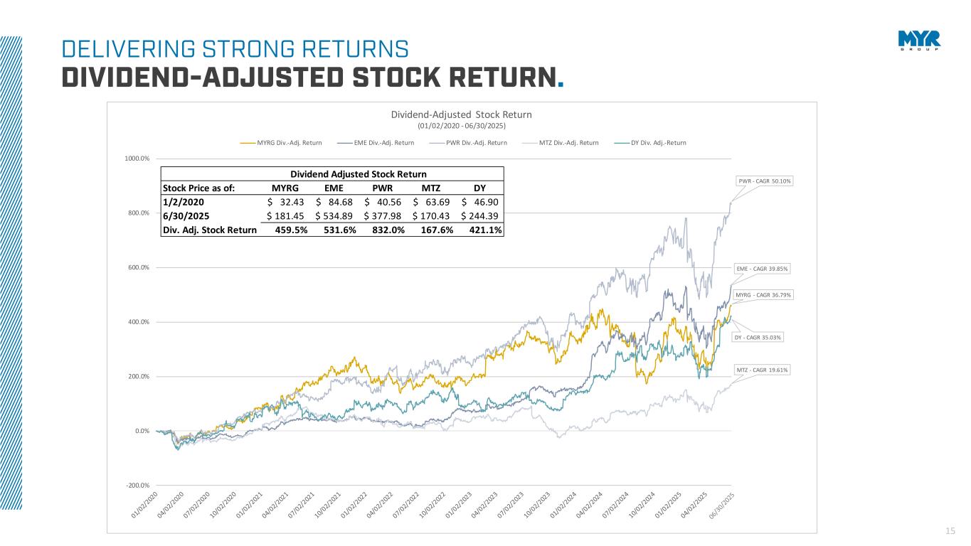 15 MYRG - CAGR 36.79% EME - CAGR 39.85% PWR - CAGR 50.10% MTZ - CAGR 19.61% DY - CAGR 35.03% -200.0% 0.0% 200.0% 400.0% 600.0% 800.0% 1000.0% Dividend-Adjusted Stock Return (01/02/2020 - 06/30/2025) MYRG Div.-Adj. Return EME Div.-Adj. Return PWR Div.-Adj. Return MTZ Div.-Adj. Return DY Div. Adj.-Return DELIVERING STRONG RETURNS DIVIDEND-ADJUSTED STOCK RETURN. Dividend Adjusted Stock Return Stock Price as of: MYRG EME PWR MTZ DY 1/2/2020 32.43$ 84.68$ 40.56$ 63.69$ 46.90$ 6/30/2025 181.45$ 534.89$ 377.98$ 170.43$ 244.39$ Div. Adj. Stock Return 459.5% 531.6% 832.0% 167.6% 421.1%