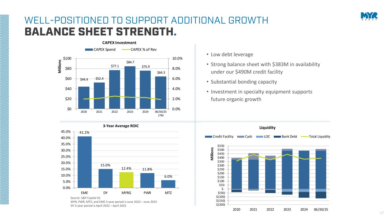 16 Q2 2025 RESULTS $26.5M Net Income or $1.70 Per Diluted Share $2.64B Backlog $900.3M Revenue Our second quarter performance resulted in quarterly revenues of $900 million and backlog of $2.64 billion with net income, consolidated gross profit, gross margin and EBITDA all increasing compared to the same period of 2024.” Mr. Swartz continued, “This quarter, we secured multiple master services agreements and new projects across our core markets, further expanding our business footprint. We value the strong relationships we’ve established with our customers and continue to leverage the full capabilities of MYR Group companies to enhance the value we deliver while strategically positioning ourselves for future growth. Rick Swartz President and CEO DELIVERING STRONG RETURNS FINANCIAL SNAPSHOT. T&D $1.90B C&I $1.55B Business Segment Revenue June 30, 2025 LTM Total Revenue $3.45B Net Income $76.4M Earnings per Diluted Share $4.79 EBITDA * $188.4M Free Cash Flow * $108.6M * See reconciliation of non-GAAP measures on slide 20 June 30, 2025 LTM FINANCIAL OVERVIEW Total Revenue $3.45B