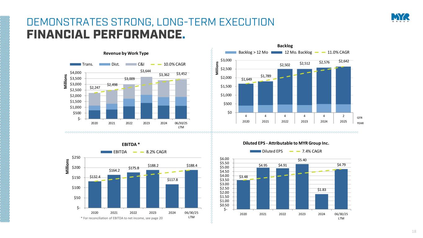 17 41.2% 15.0% 12.4% 11.8% 6.0% 0.0% 5.0% 10.0% 15.0% 20.0% 25.0% 30.0% 35.0% 40.0% 45.0% EME DY MYRG PWR MTZ 3-Year Average ROIC WELL-POSITIONED TO SUPPORT ADDITIONAL GROWTH BALANCE SHEET STRENGTH. Source: S&P Capital IQ MYR, PWR, MTZ, and EME 3-year period is June 2022 – June 2025 DY 3-year period is April 2022 – April 2025 • Low debt leverage • Strong balance sheet with $383M in availability under our $490M credit facility • Substantial bonding capacity • Investment in specialty equipment supports future organic growth $44.4 $52.4 $77.1 $84.7 $75.9 $64.3 0.0% 2.0% 4.0% 6.0% 8.0% 10.0% $0 $20 $40 $60 $80 $100 2020 2021 2022 2023 2024 06/30/25 LTM M ill io n s CAPEX Investment CAPEX Spend CAPEX % of Rev $(200) $(150) $(100) $(50) $- $50 $100 $150 $200 $250 $300 $350 $400 $450 $500 $550 2020 2021 2022 2023 2024 06/30/25 M ill io n s Liquidity Credit Facility Cash LOC Bank Debt Total Liquidity