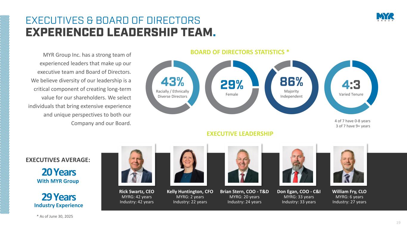 18 $132.4 $164.2 $175.8 $188.2 $117.8 $188.4 $- $50 $100 $150 $200 $250 2020 2021 2022 2023 2024 06/30/25 LTM M ill io n s EBITDA * EBITDA 8.2% CAGR DEMONSTRATES STRONG, LONG-TERM EXECUTION FINANCIAL PERFORMANCE. * For reconciliation of EBITDA to net income, see page 20 QTR YEAR $2,247 $2,498 $3,009 $3,644 $3,362 $3,452 $- $500 $1,000 $1,500 $2,000 $2,500 $3,000 $3,500 $4,000 2020 2021 2022 2023 2024 06/30/25 LTM M ill io n s Revenue by Work Type Trans. Dist. C&I 10.0% CAGR $1,649 $1,789 $2,502 $2,512 $2,576 $2,642 $0 $500 $1,000 $1,500 $2,000 $2,500 $3,000 4 4 4 4 4 2 2020 2021 2022 2023 2024 2025 M il li o n s Backlog Backlog > 12 Mo 12 Mo. Backlog 11.0% CAGR $3.48 $4.95 $4.91 $5.40 $1.83 $4.79 $- $0.50 $1.00 $1.50 $2.00 $2.50 $3.00 $3.50 $4.00 $4.50 $5.00 $5.50 $6.00 2020 2021 2022 2023 2024 06/30/25 LTM Diluted EPS - Attributable to MYR Group Inc. Diluted EPS 7.4% CAGR