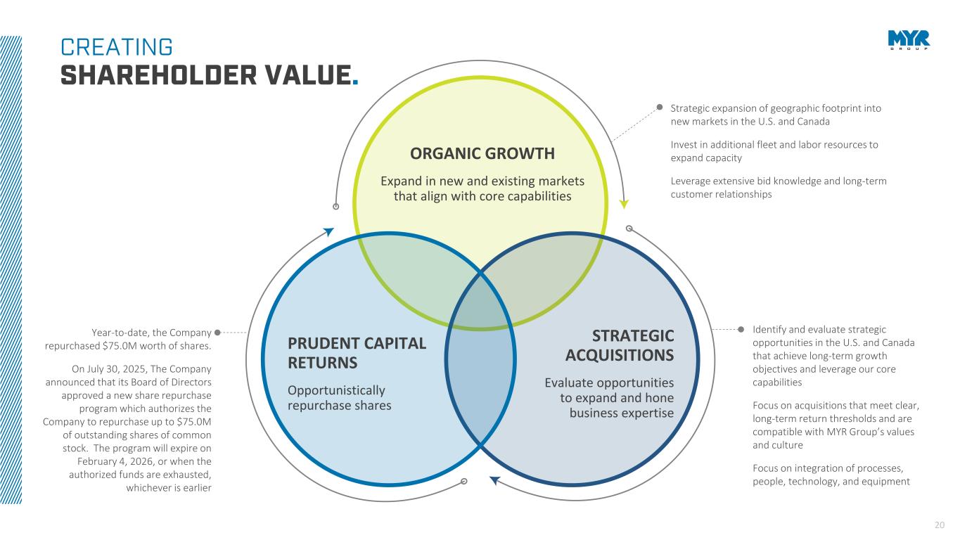 19 EXECUTIVE LEADERSHIP Rick Swartz, CEO MYRG: 42 years Industry: 42 years 20 Years EXECUTIVES AVERAGE: With MYR Group MYR Group Inc. has a strong team of experienced leaders that make up our executive team and Board of Directors. We believe diversity of our leadership is a critical component of creating long-term value for our shareholders. We select individuals that bring extensive experience and unique perspectives to both our Company and our Board. Kelly Huntington, CFO MYRG: 2 years Industry: 22 years Brian Stern, COO - T&D MYRG: 20 years Industry: 24 years Don Egan, COO - C&I MYRG: 33 years Industry: 33 years William Fry, CLO MYRG: 6 years Industry: 27 years 29 Years Industry Experience 29% Female 86% Majority Independent 43% Racially / Ethnically Diverse Directors BOARD OF DIRECTORS STATISTICS * 4:3 Varied Tenure 4 of 7 have 0-8 years 3 of 7 have 9+ years EXECUTIVES & BOARD OF DIRECTORS EXPERIENCED LEADERSHIP TEAM. * As of June 30, 2025