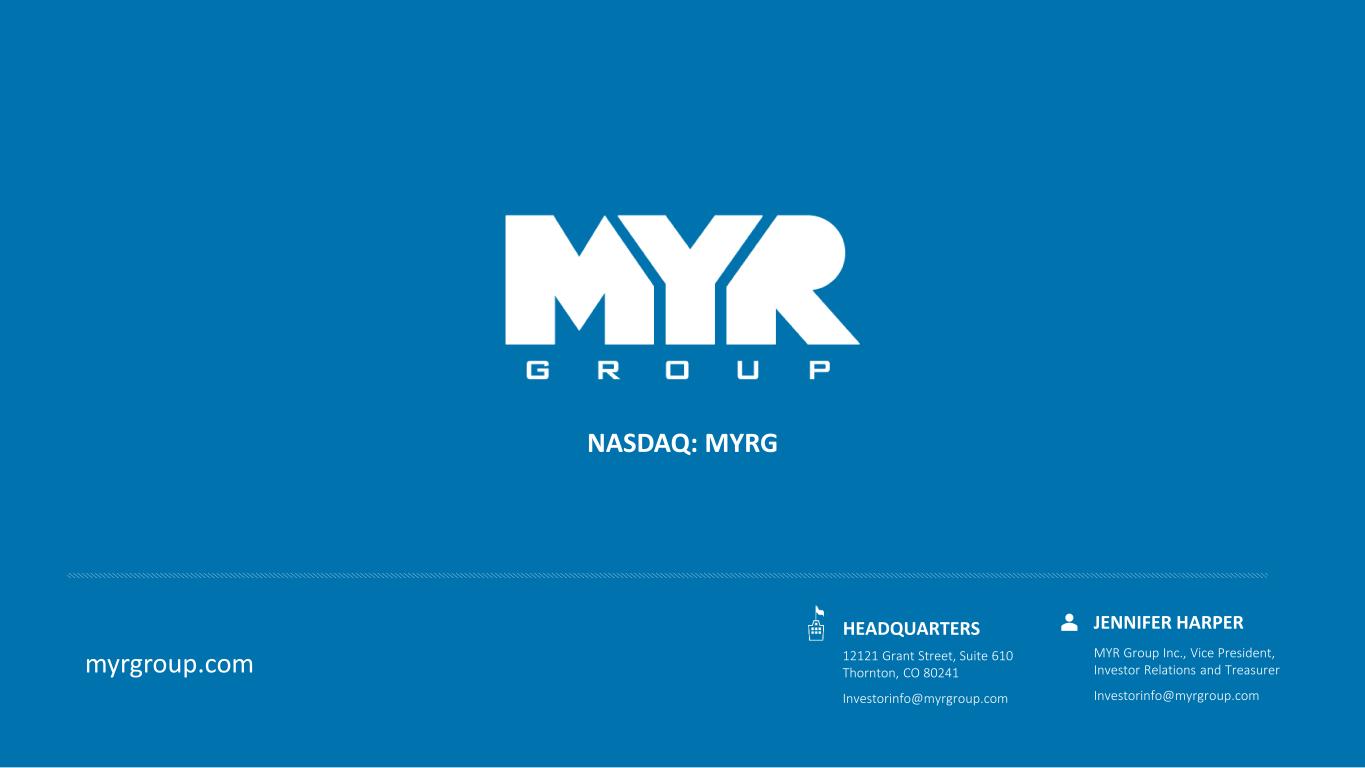 22 JENNIFER HARPER MYR Group Inc., Vice President, Investor Relations and Treasurer Investorinfo@myrgroup.com NASDAQ: MYRG 12121 Grant Street, Suite 610 Thornton, CO 80241 Investorinfo@myrgroup.com HEADQUARTERS myrgroup.com